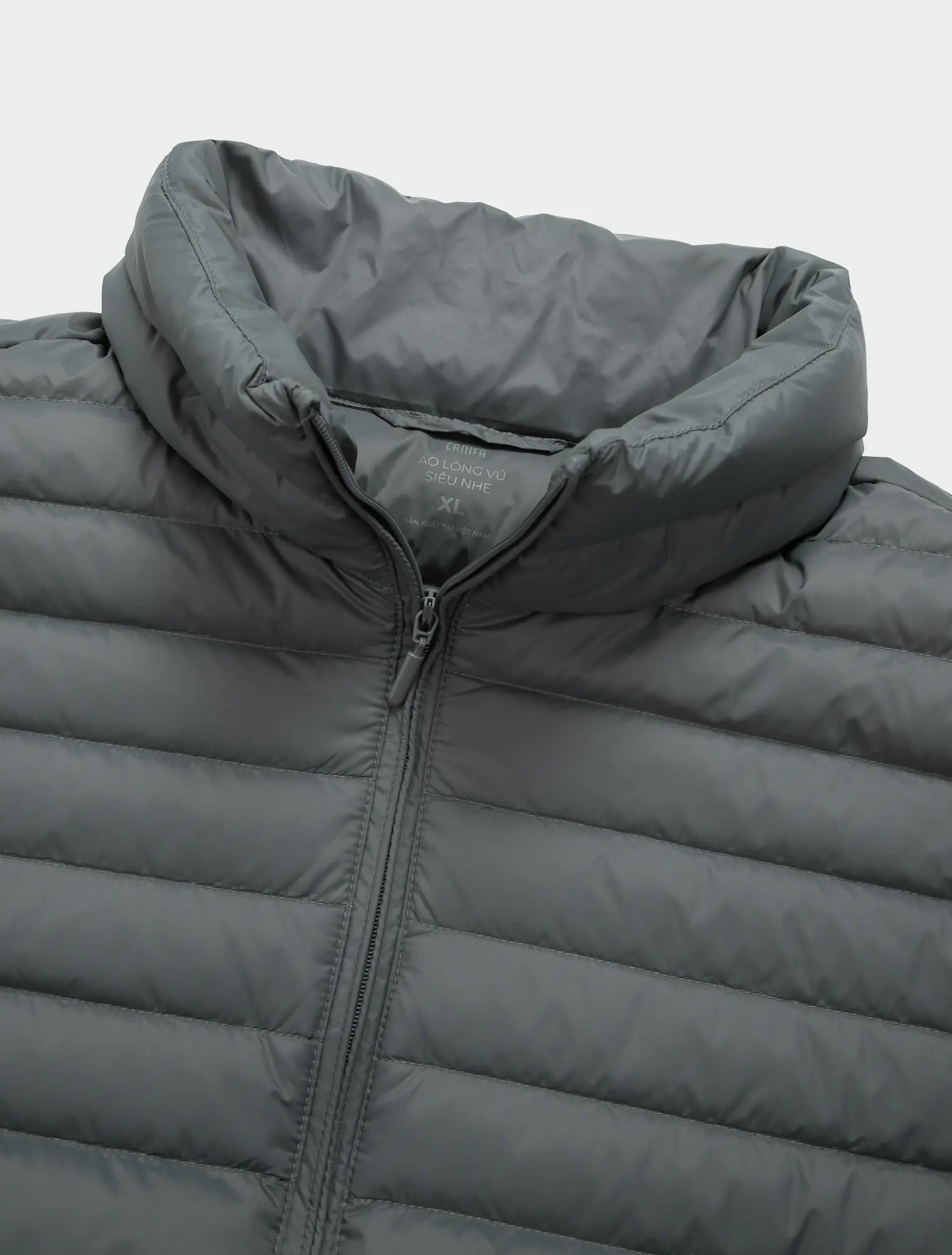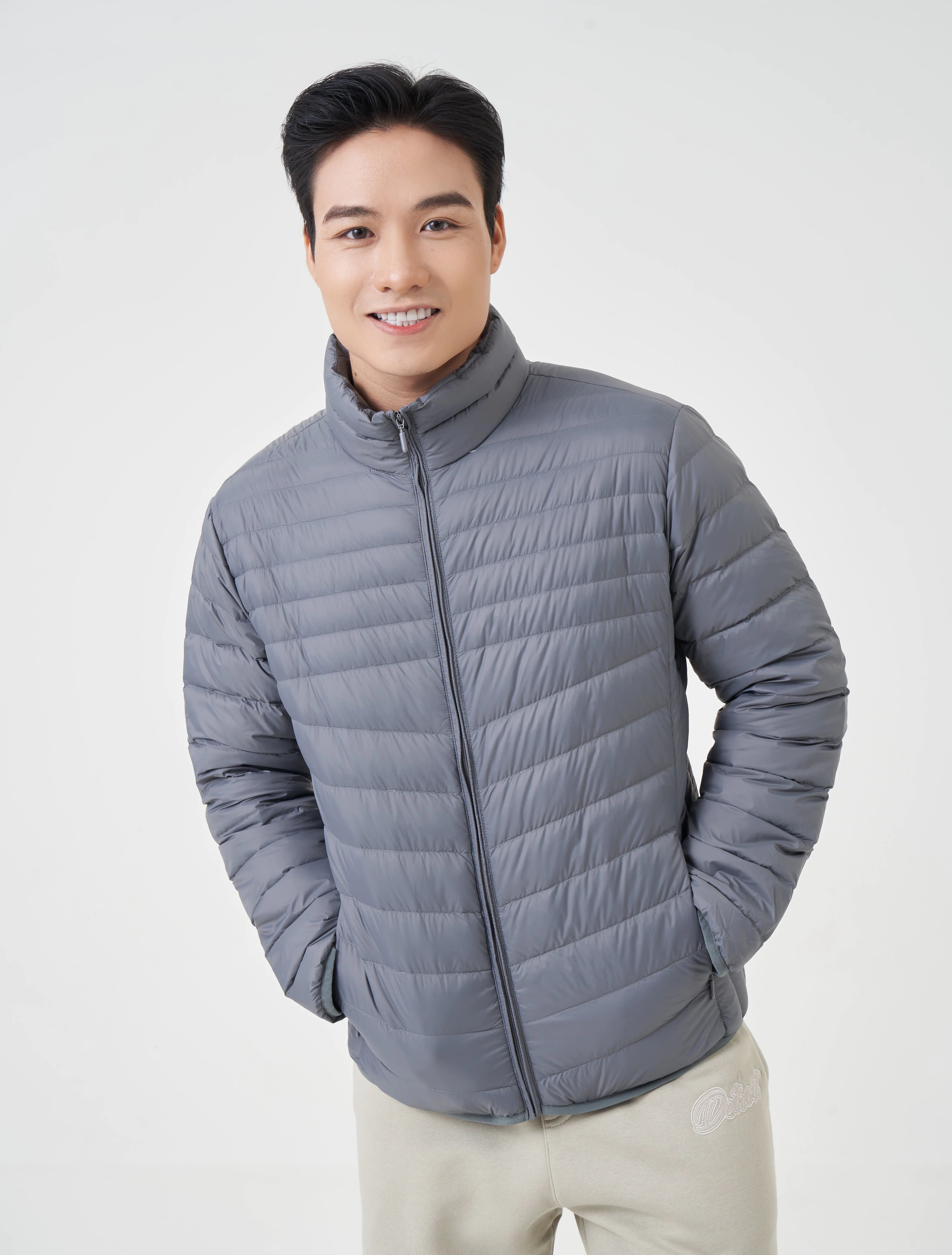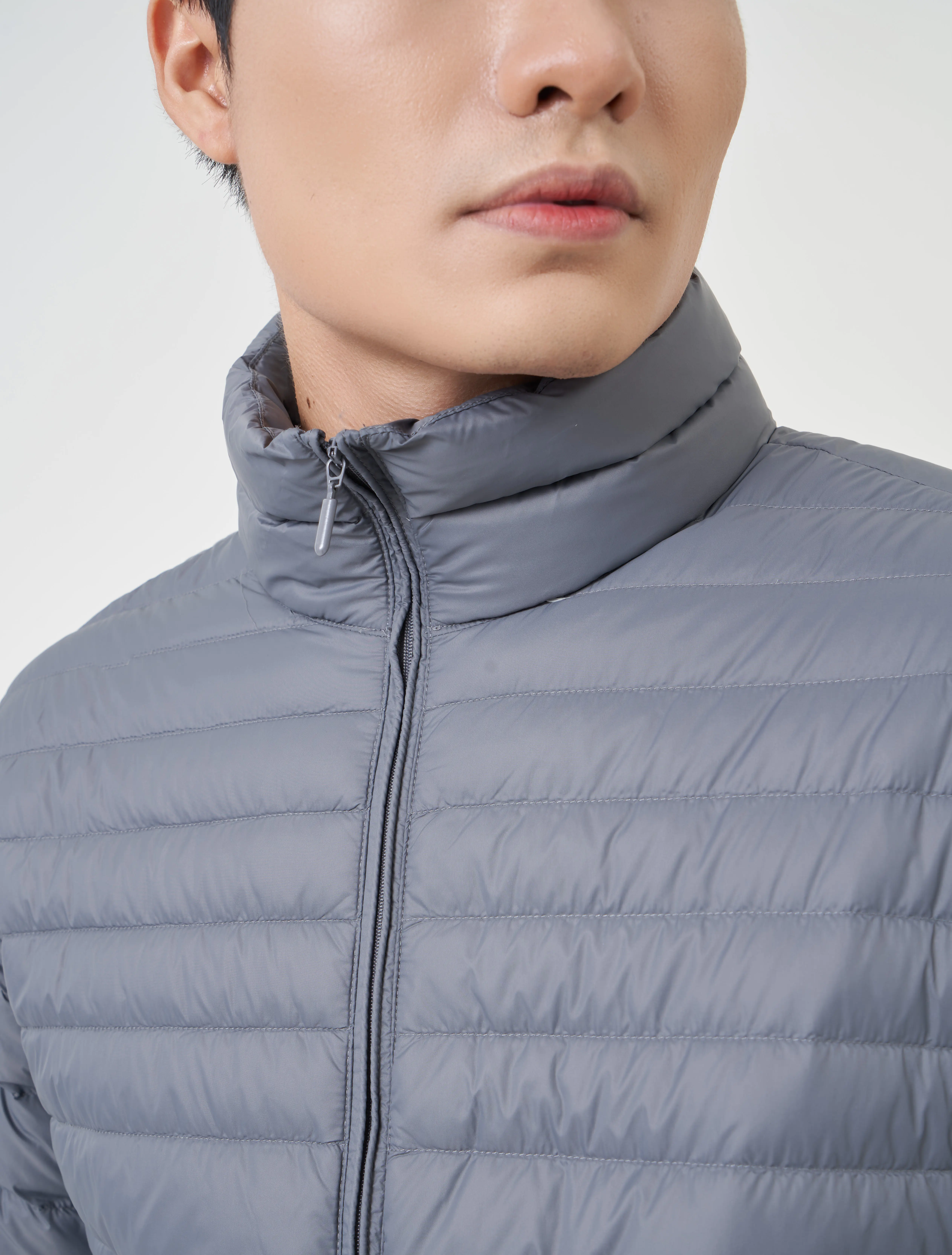 Áo khoác lông vũ nam, cổ cao, chống thấm nước. Phần cửa tay, gấu thân có thiết kế bo chun kín tránh mất nhiệt khi mặc.