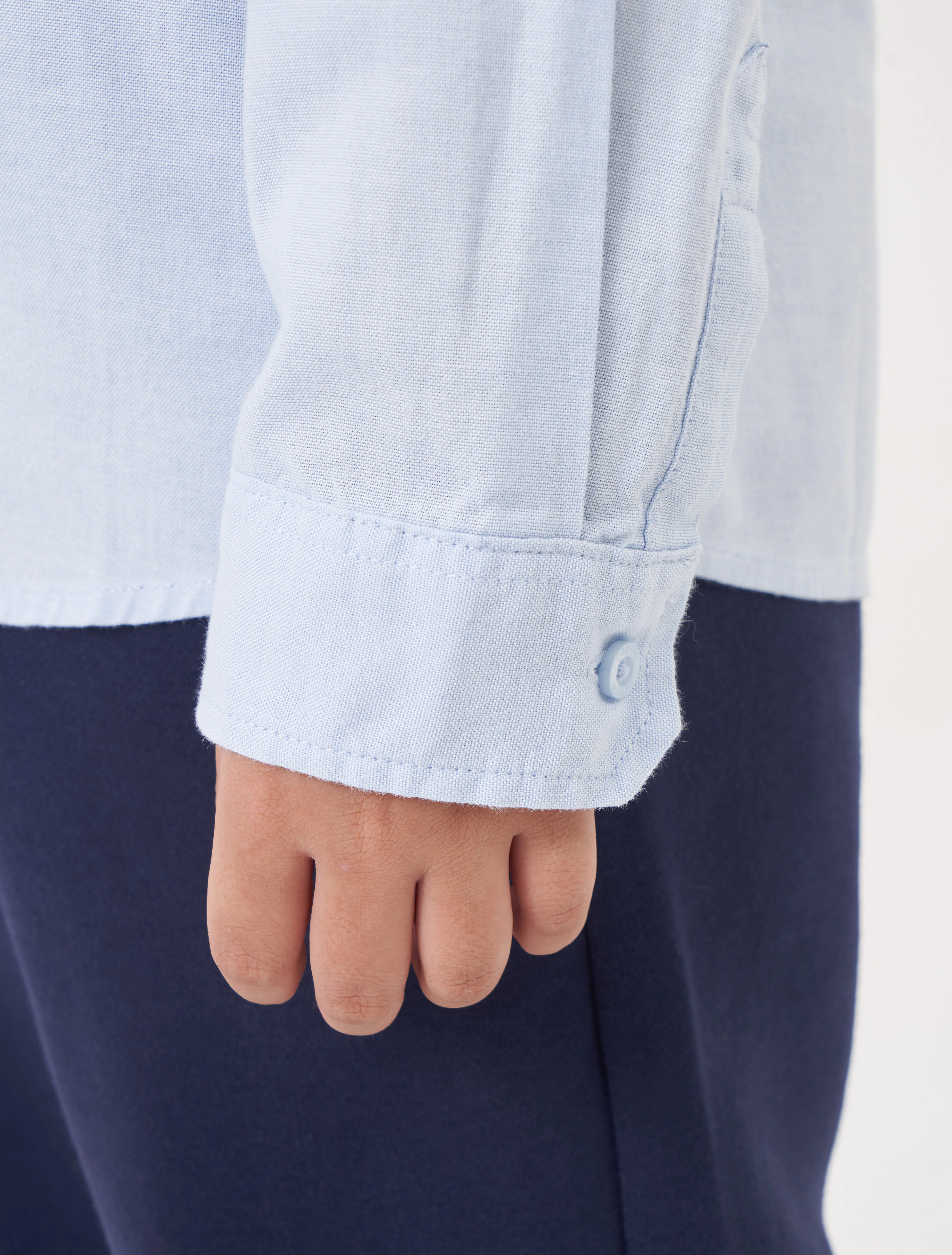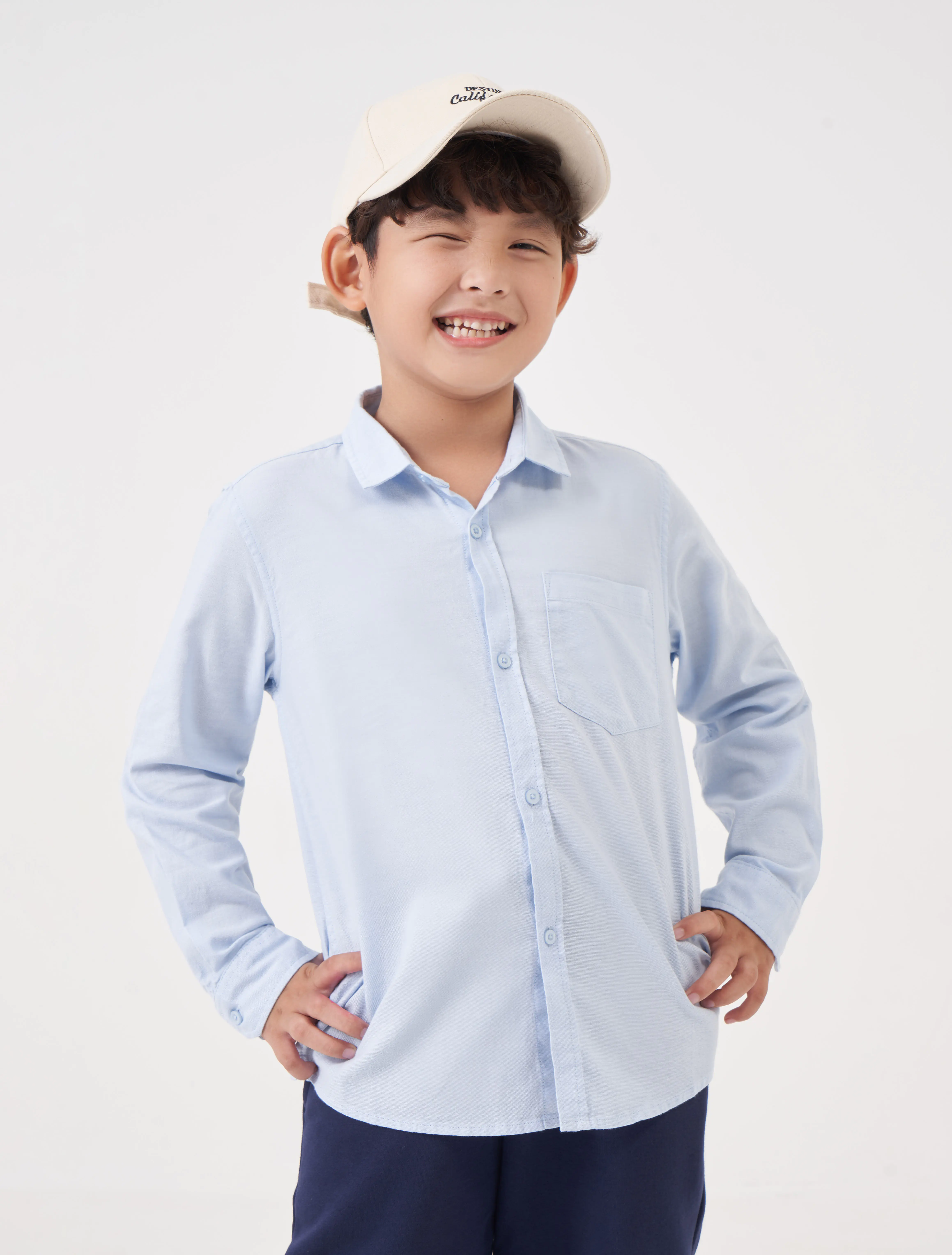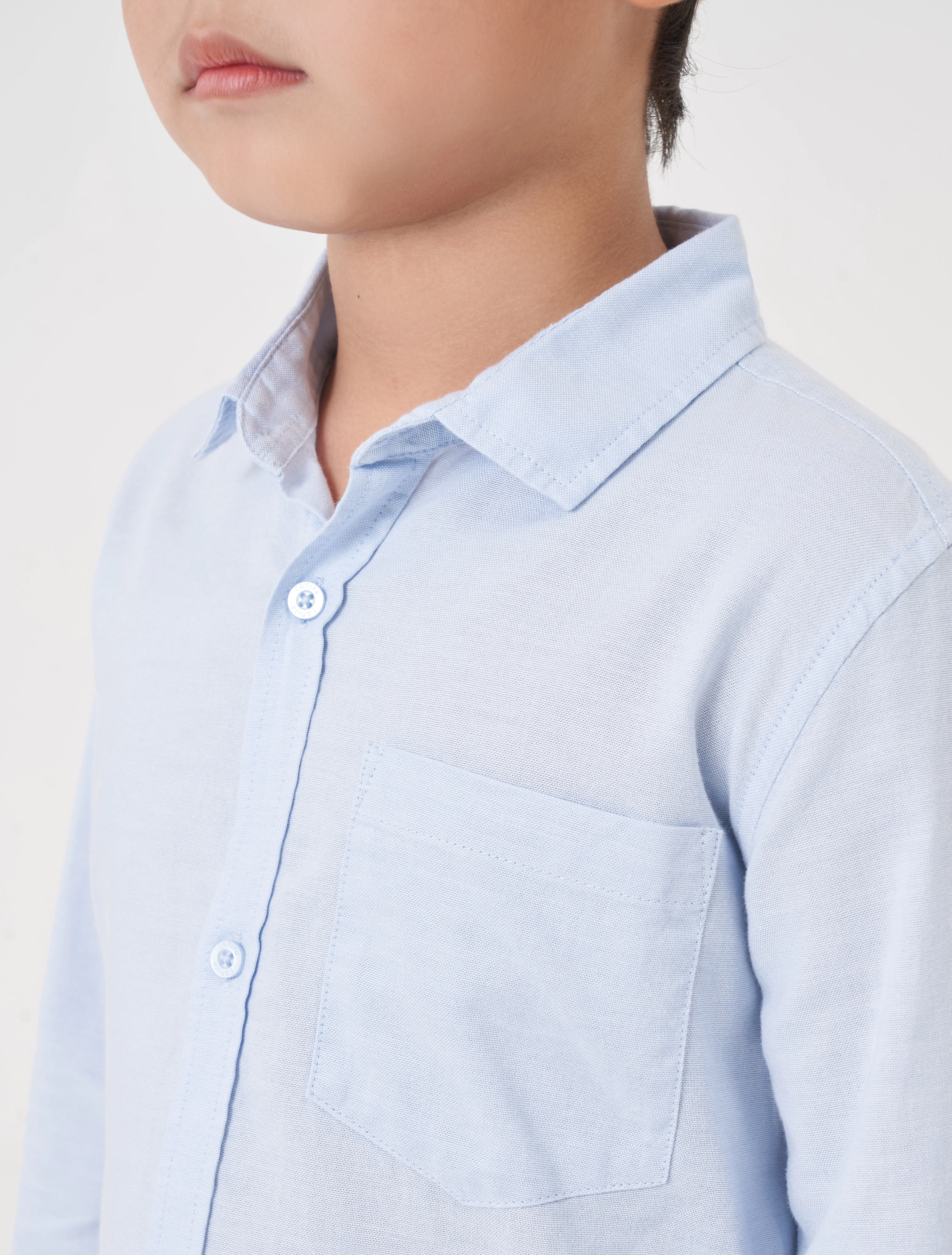 Áo sơ mi cổ đức dài tay. Có hàng khuy cài phía trước, thân trước ốp túi ngực.
