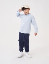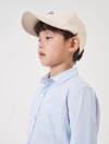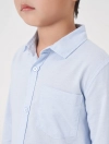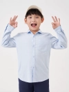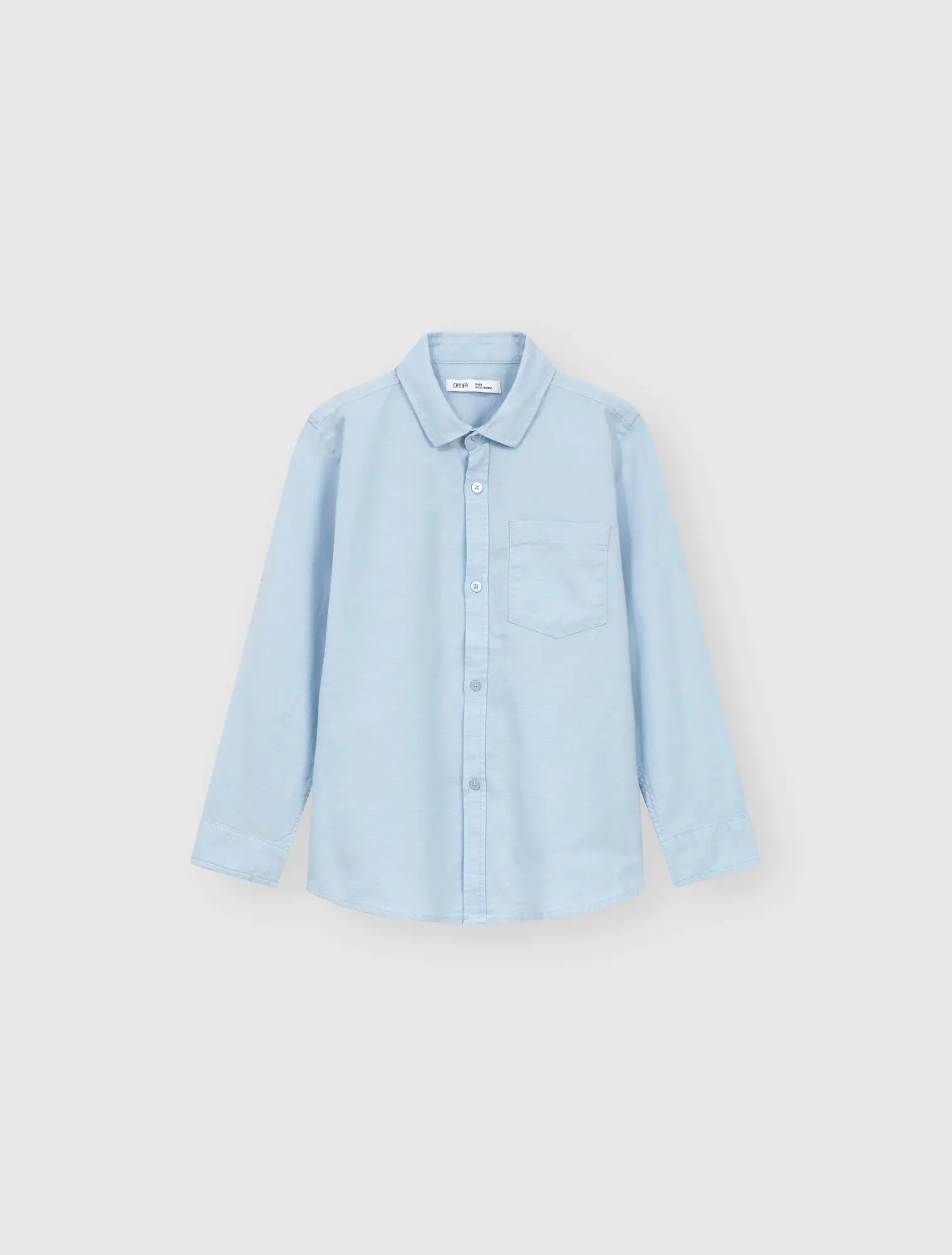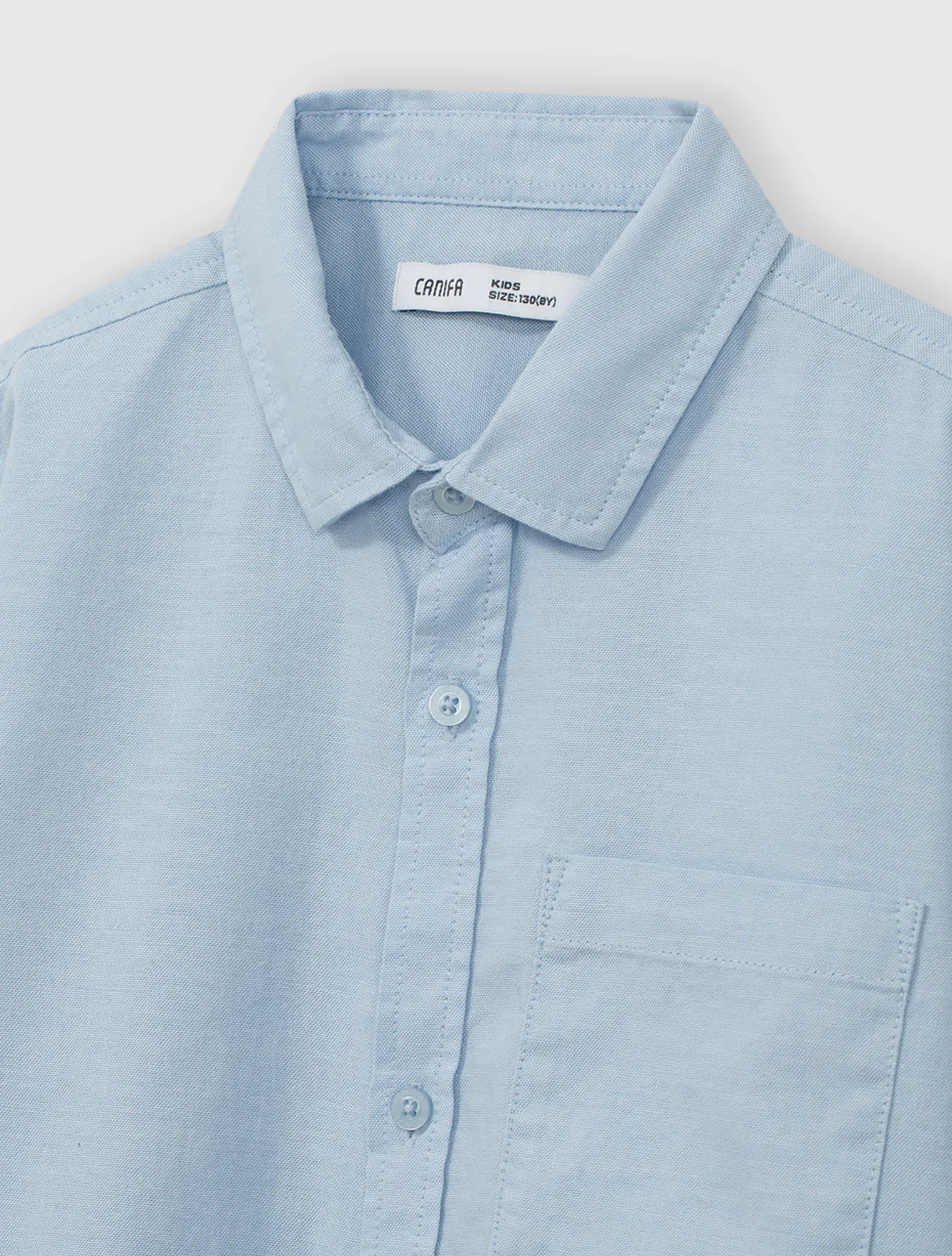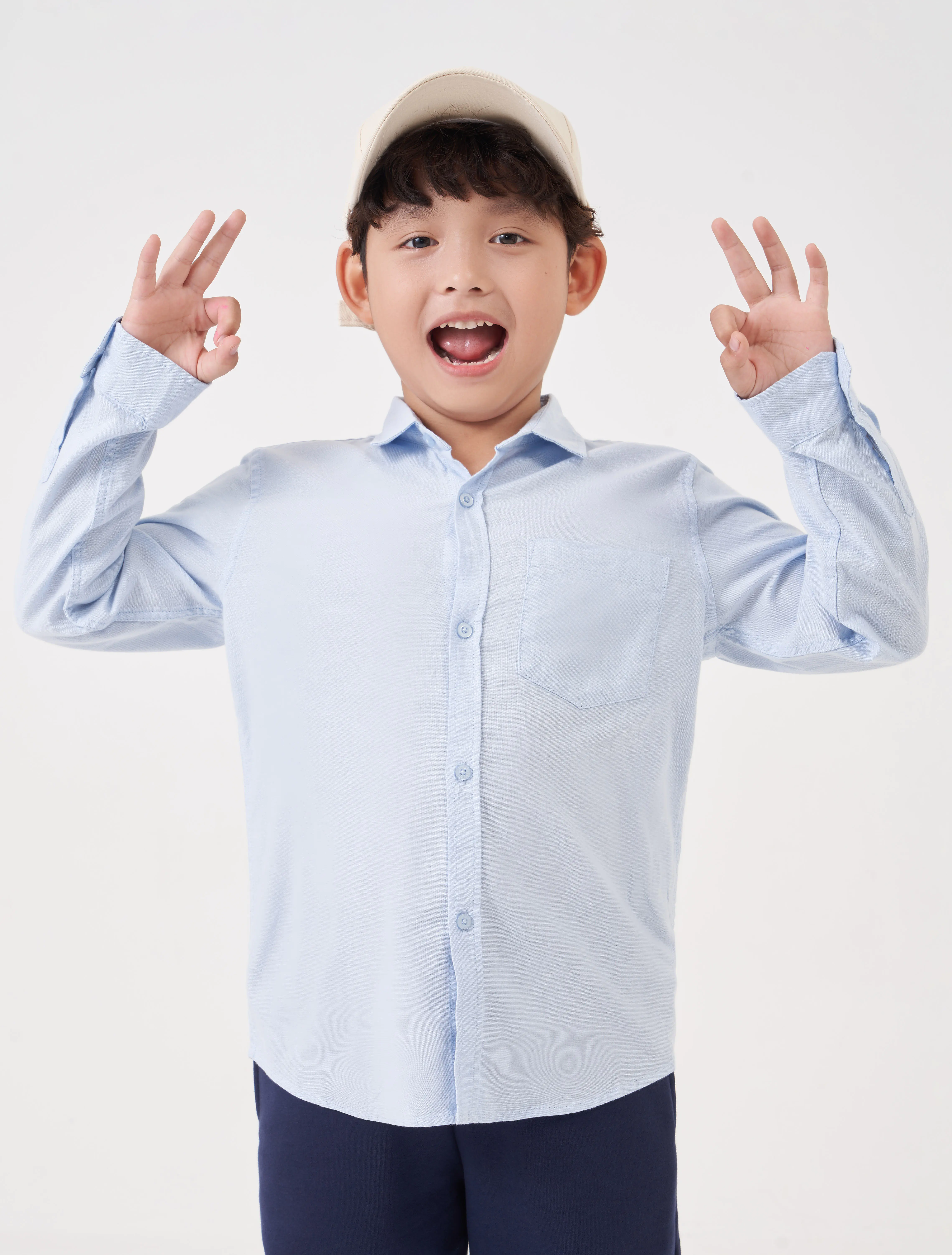 Áo sơ mi cổ đức dài tay. Có hàng khuy cài phía trước, thân trước ốp túi ngực.