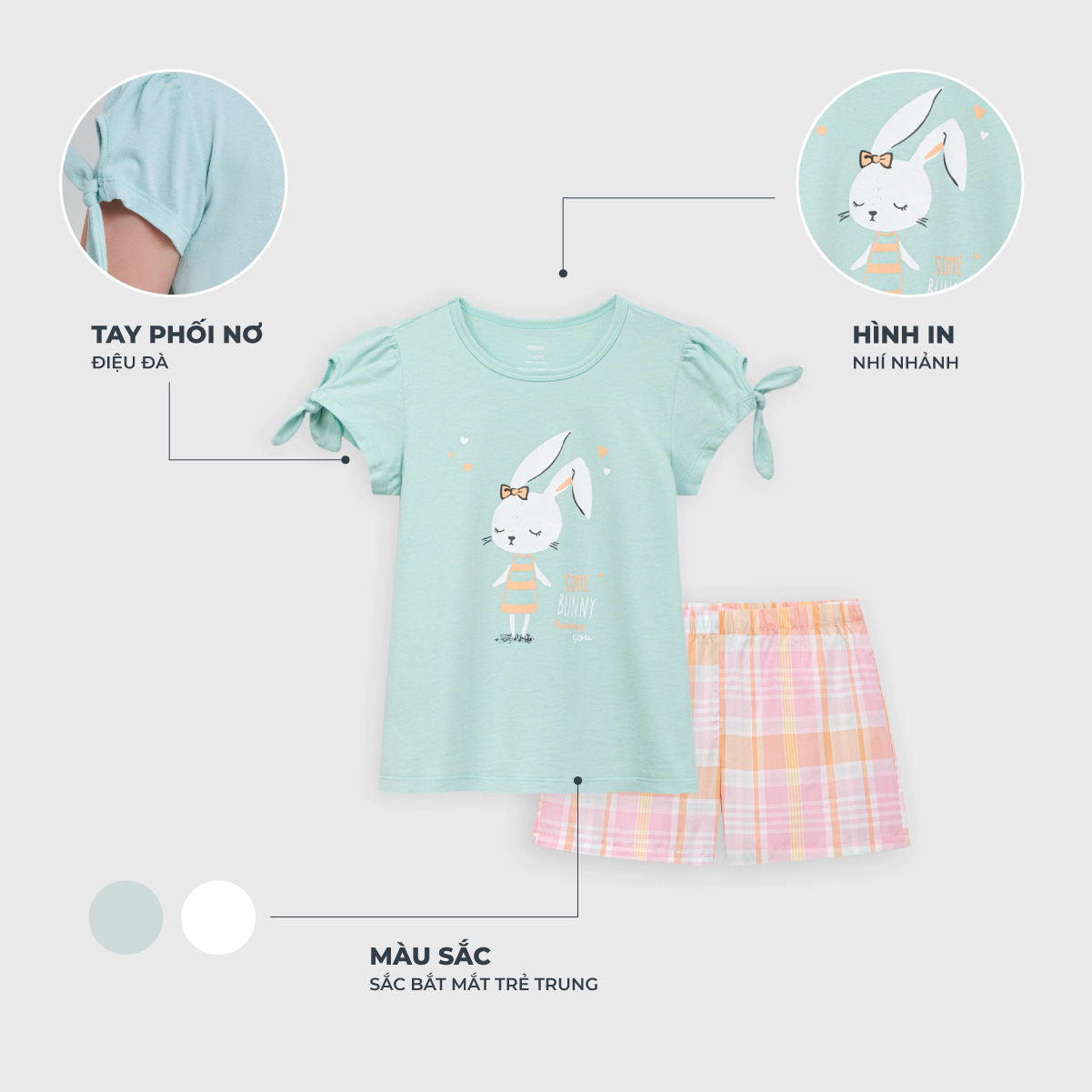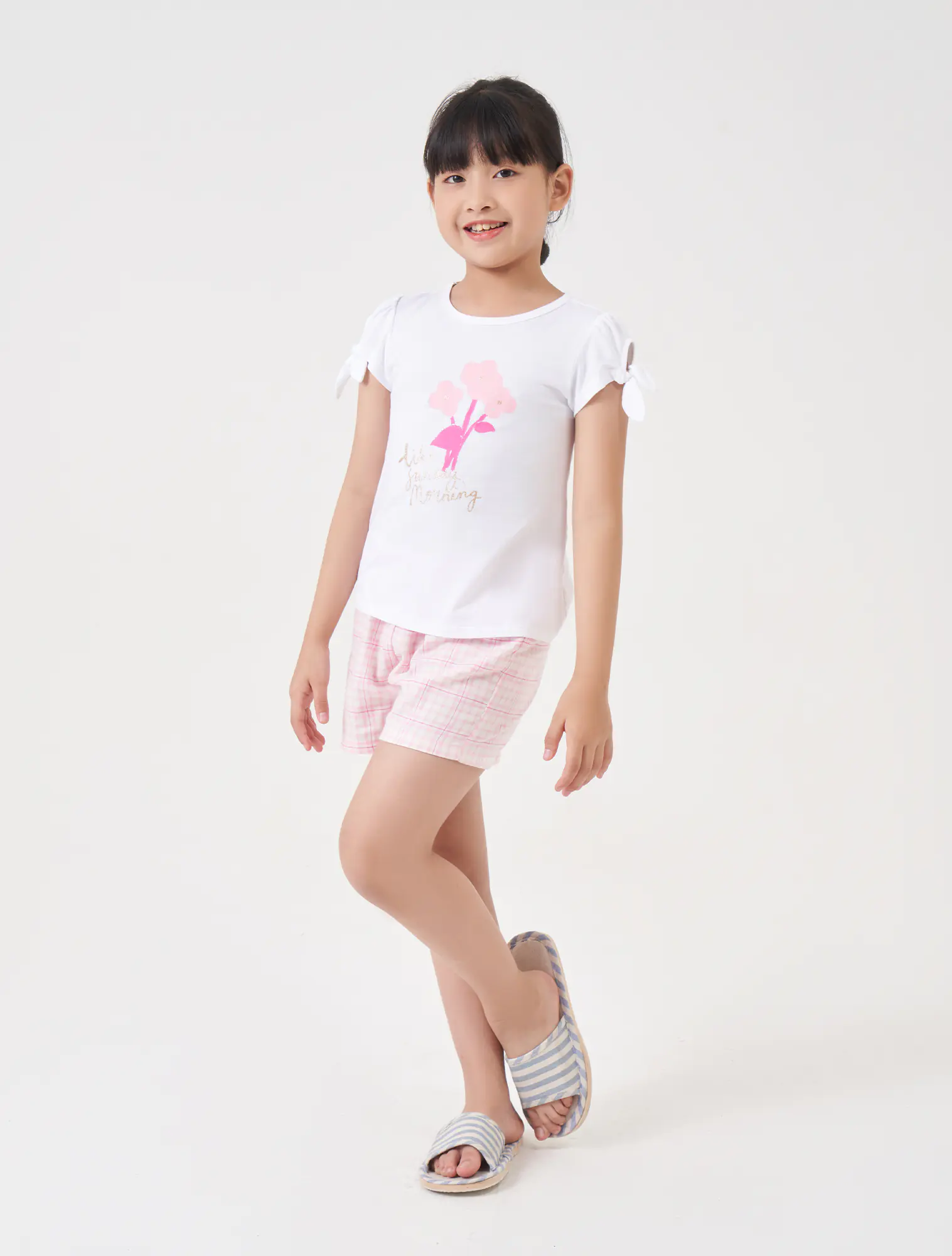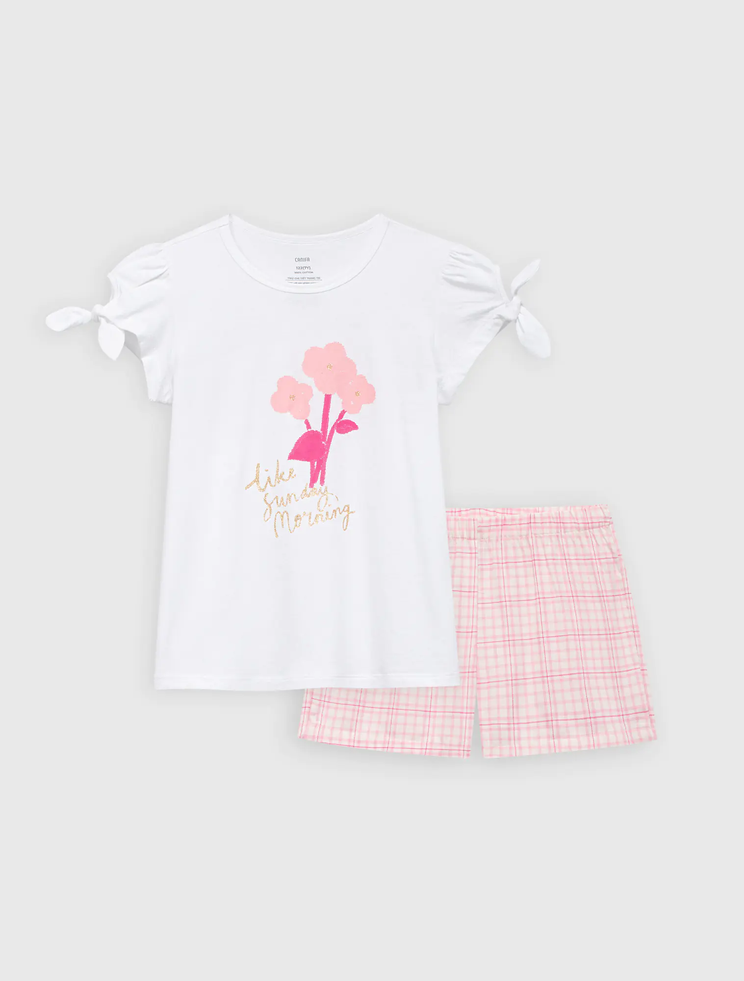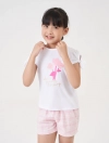 Bộ mặc nhà cộc tay, quần đùi họa tiết kẻ. Hình in đơn giản, giúp bé năng động thoải mái cả ngày.
