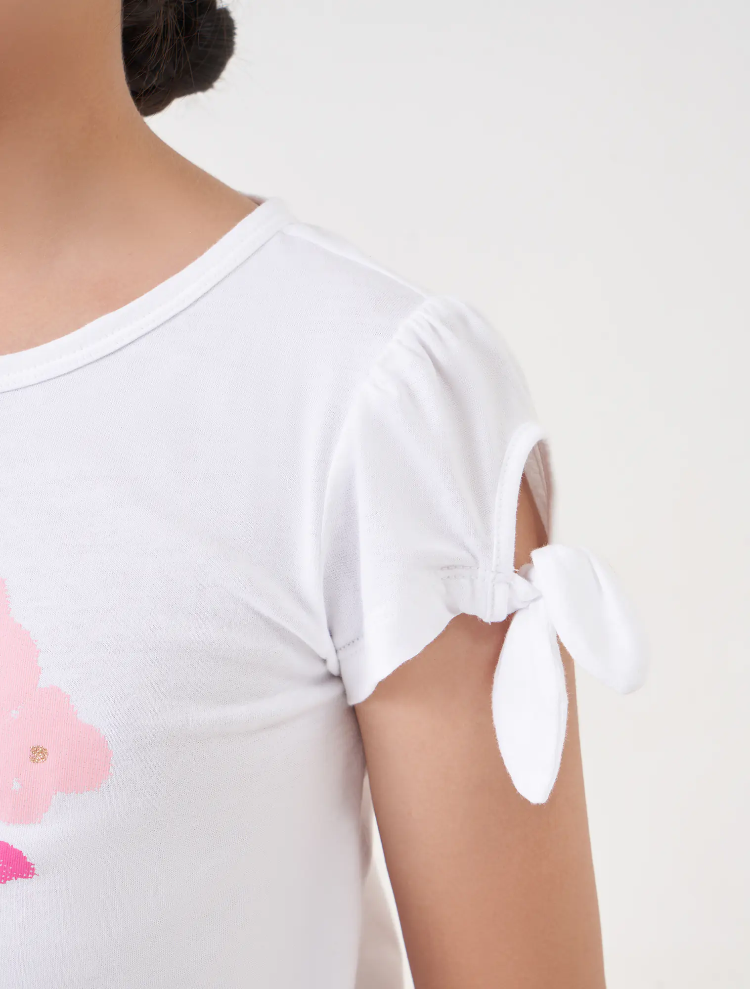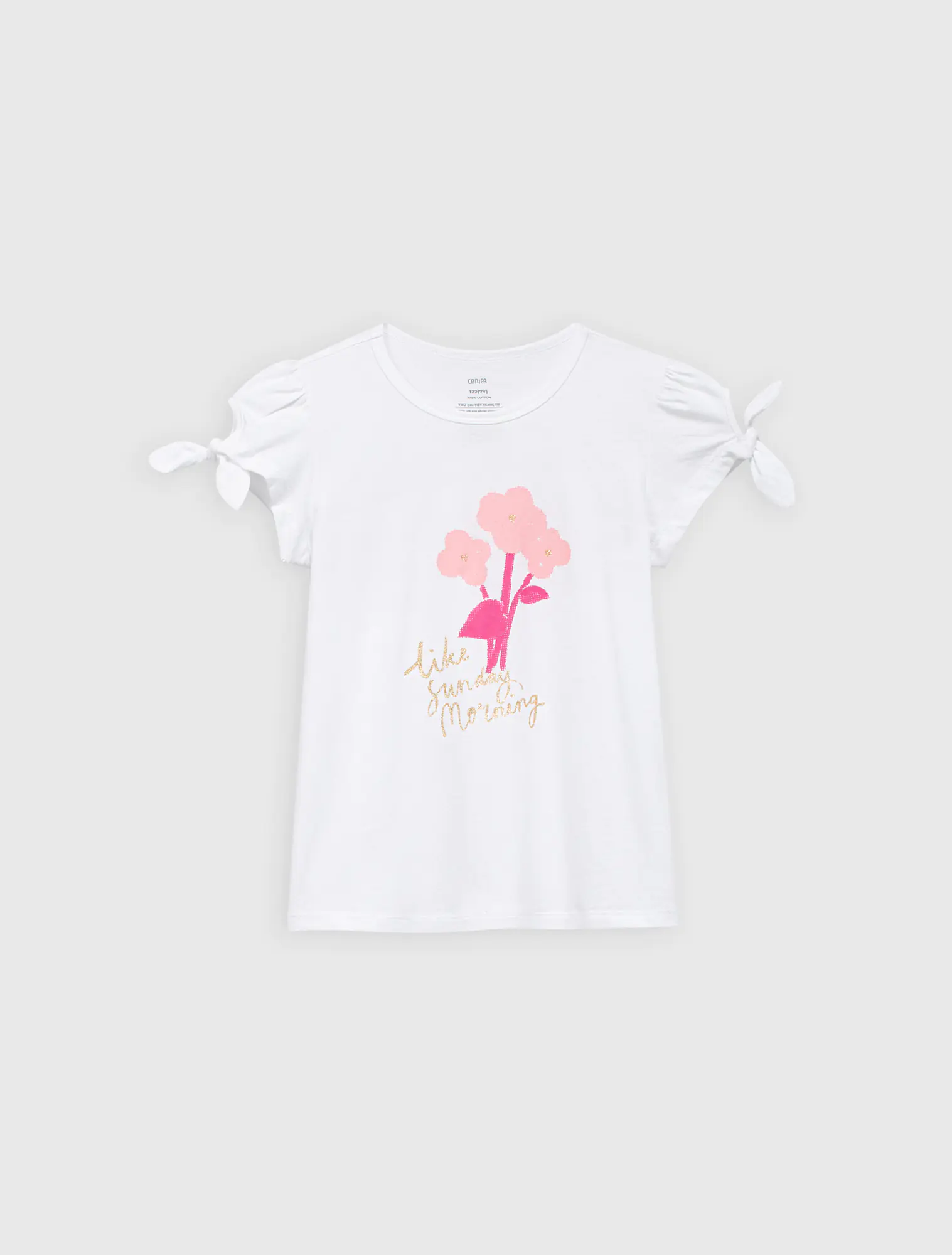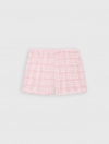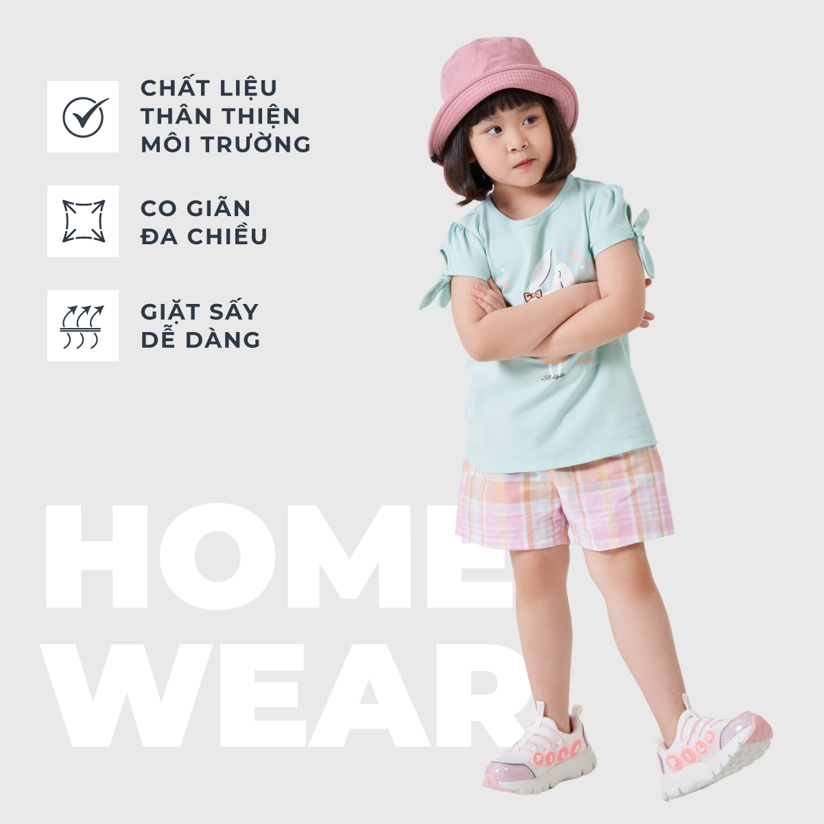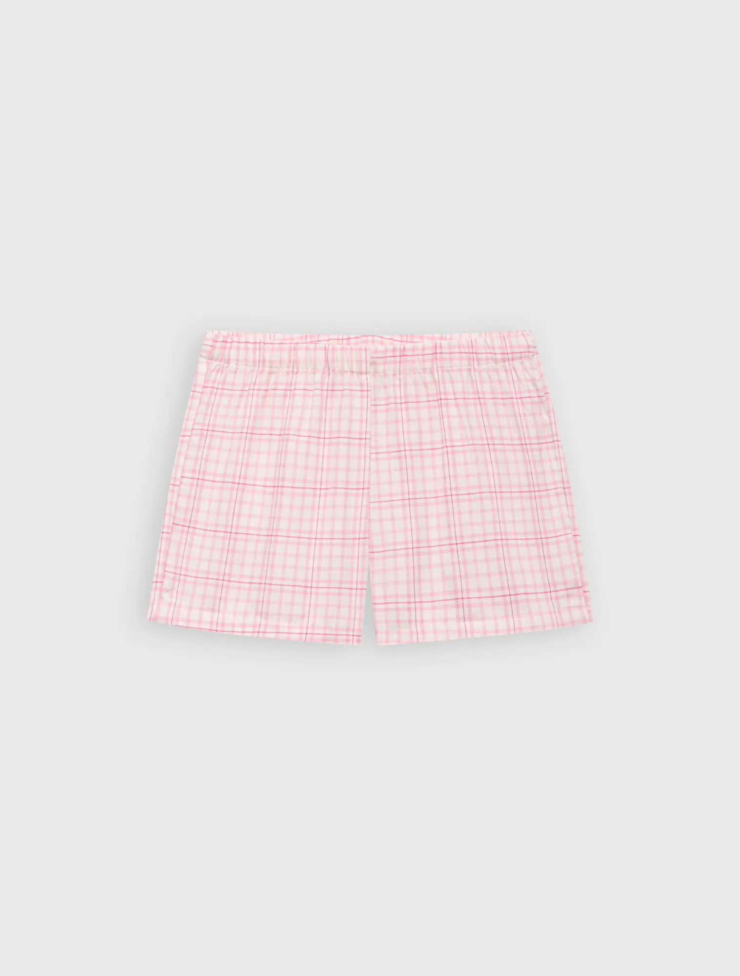 Bộ mặc nhà cộc tay, quần đùi họa tiết kẻ. Hình in đơn giản, giúp bé năng động thoải mái cả ngày.