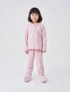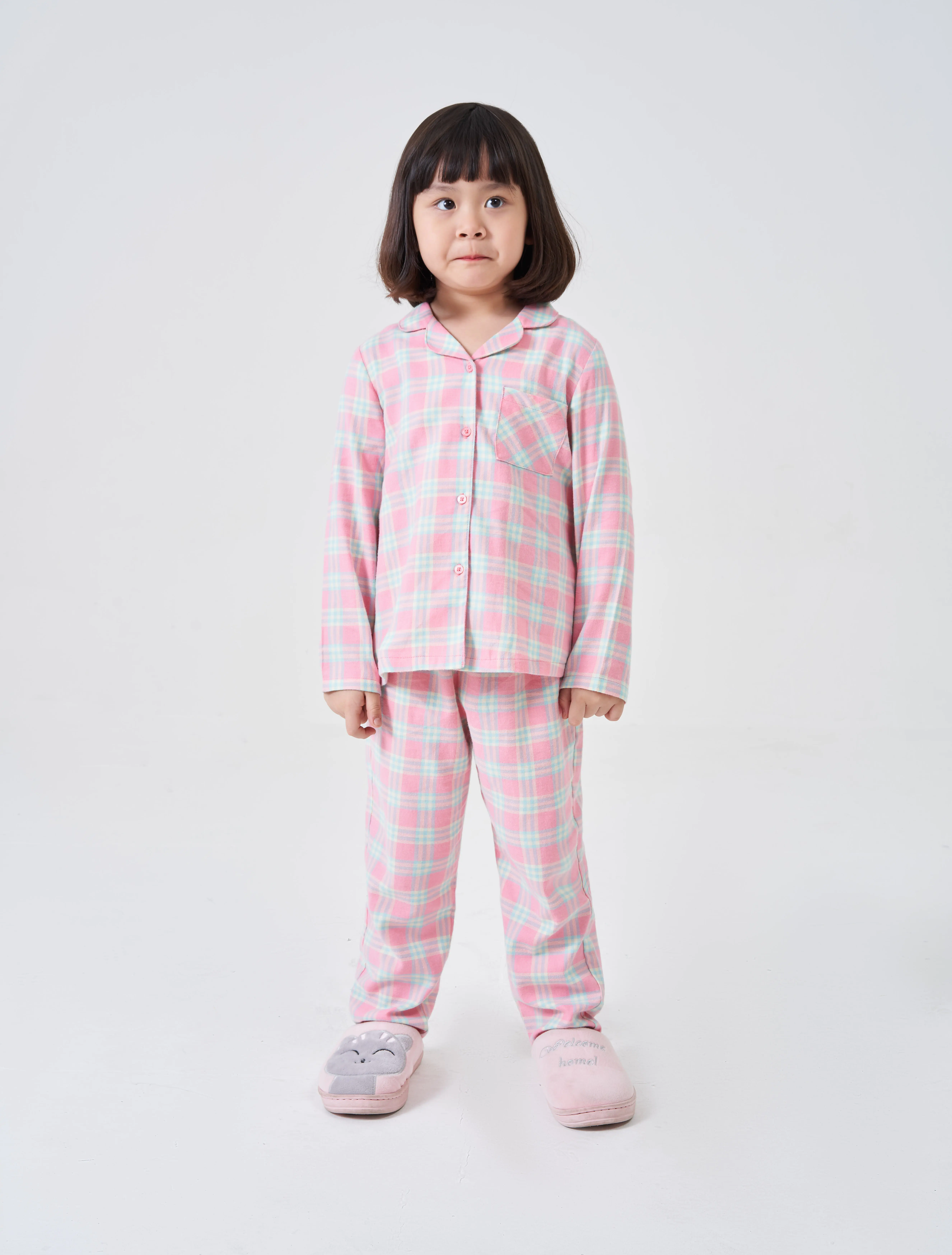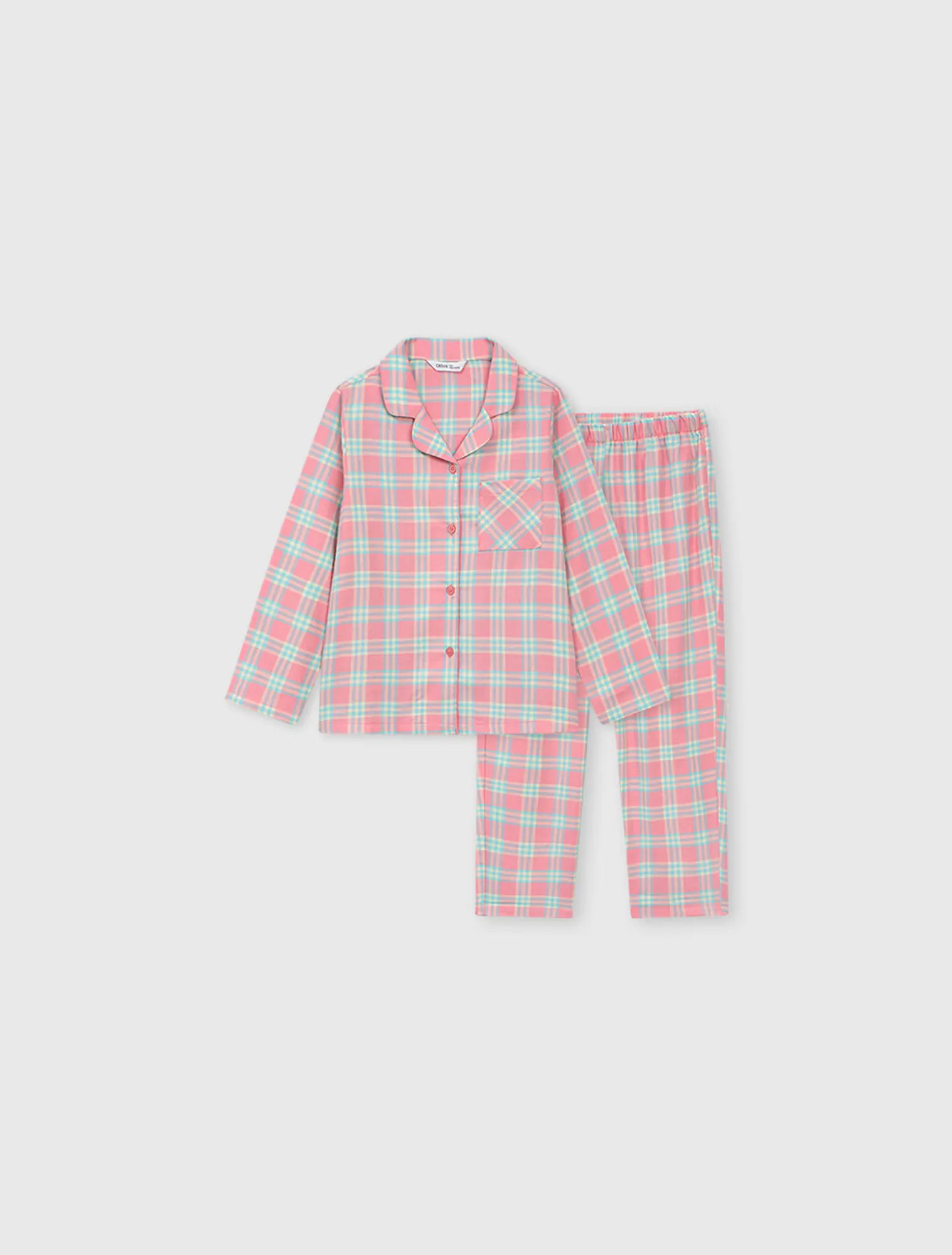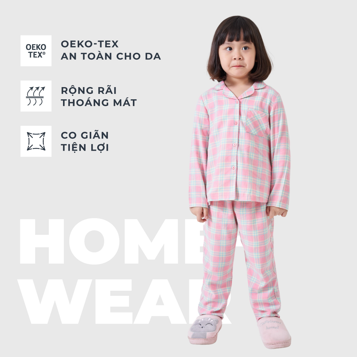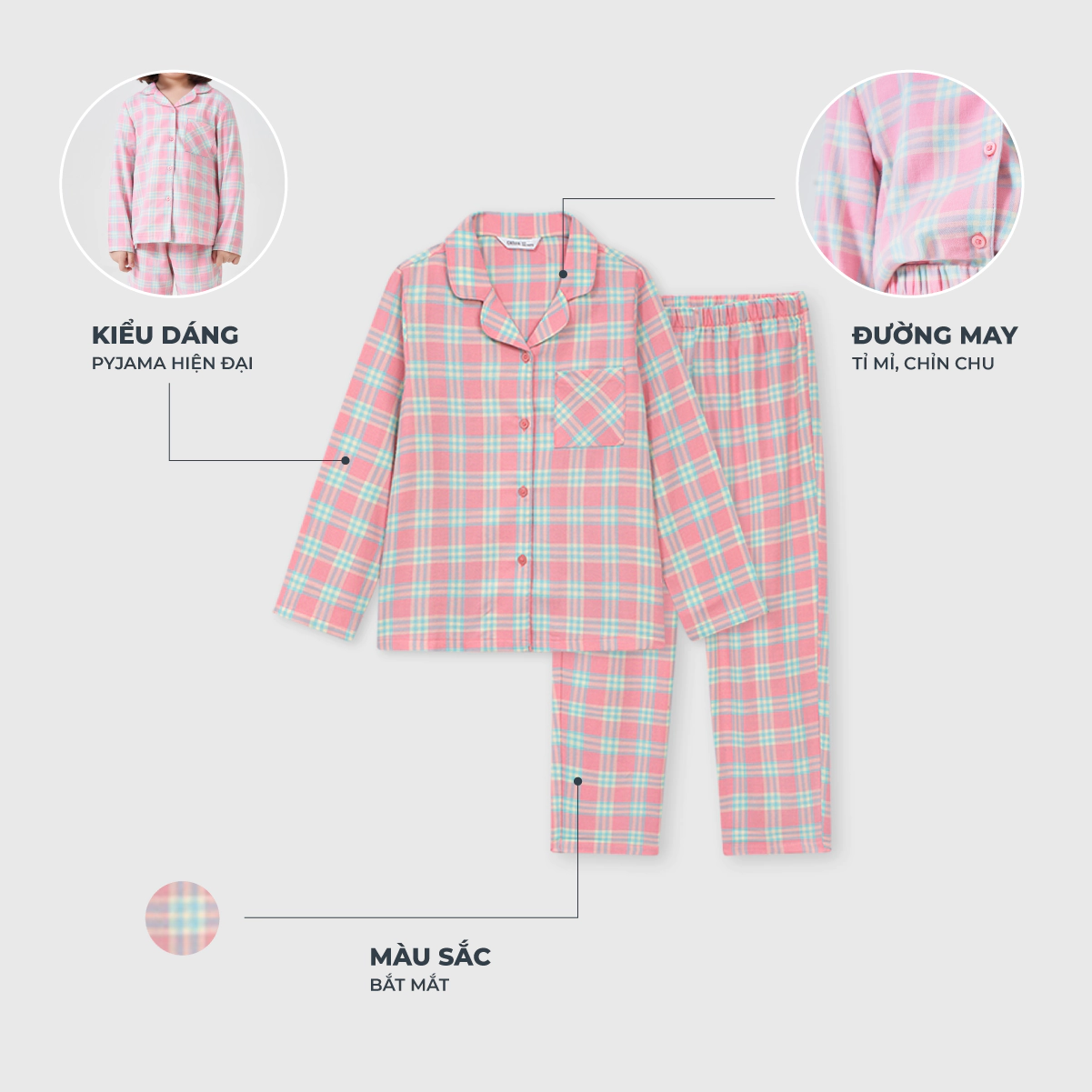 Bộ pyjama bé gái dài tay hoạ tiết kẻ, phom dáng cơ bản, chất liệu cotton mềm mại thoải mái.