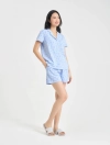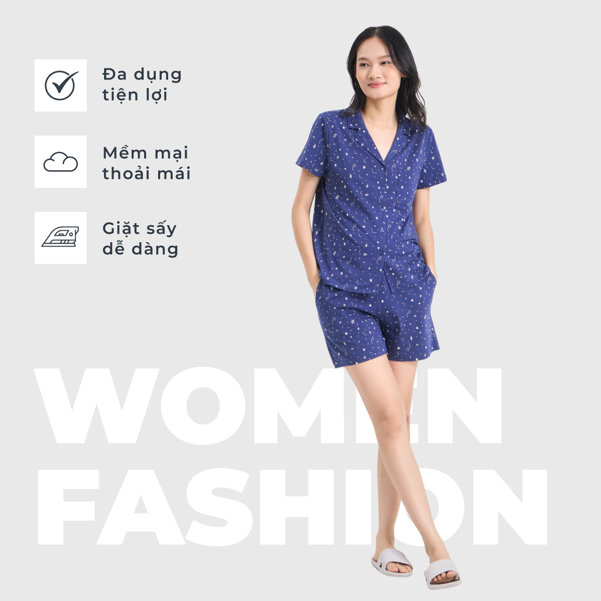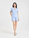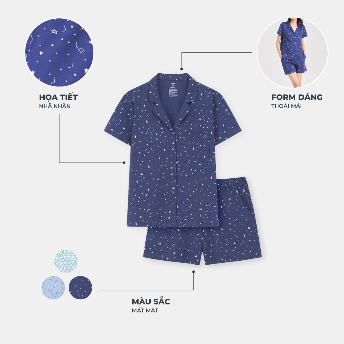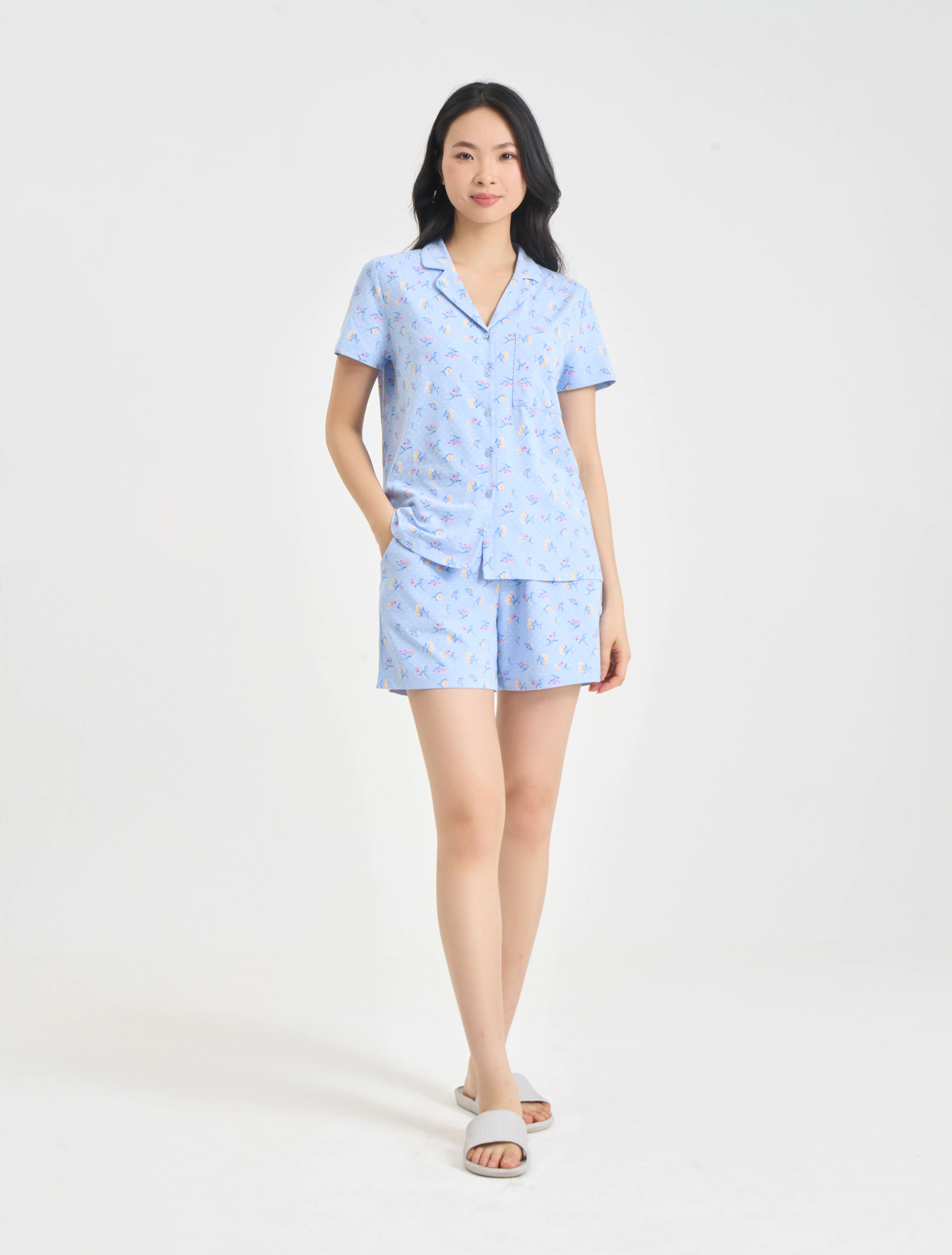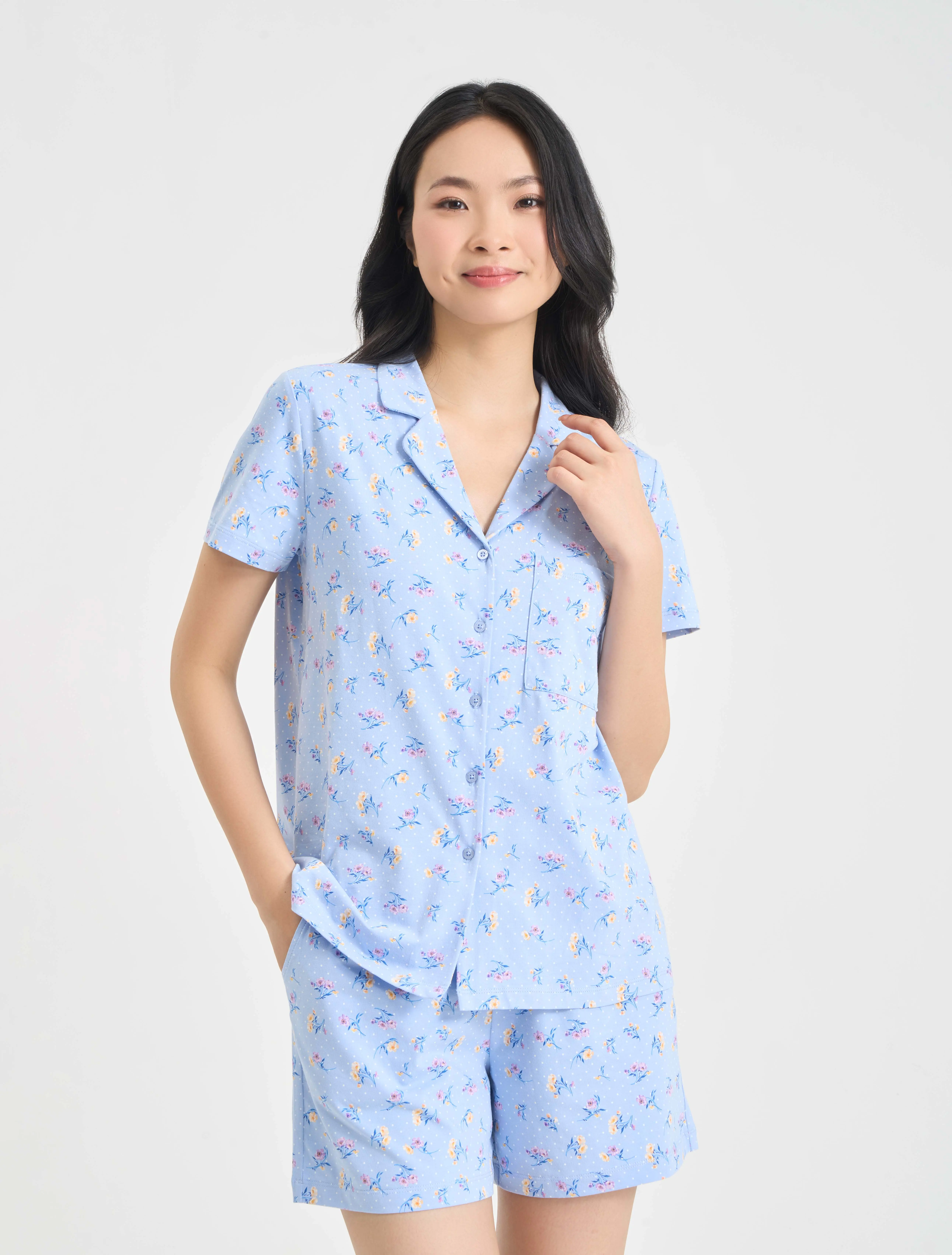 Bộ mặc nhà pyjamas nữ cộc tay quần soóc. Màu sắc, họa tiết nhã nhặn, nữ tính, phù hợp các hoàn cảnh nghỉ ngơi thư giãn.