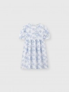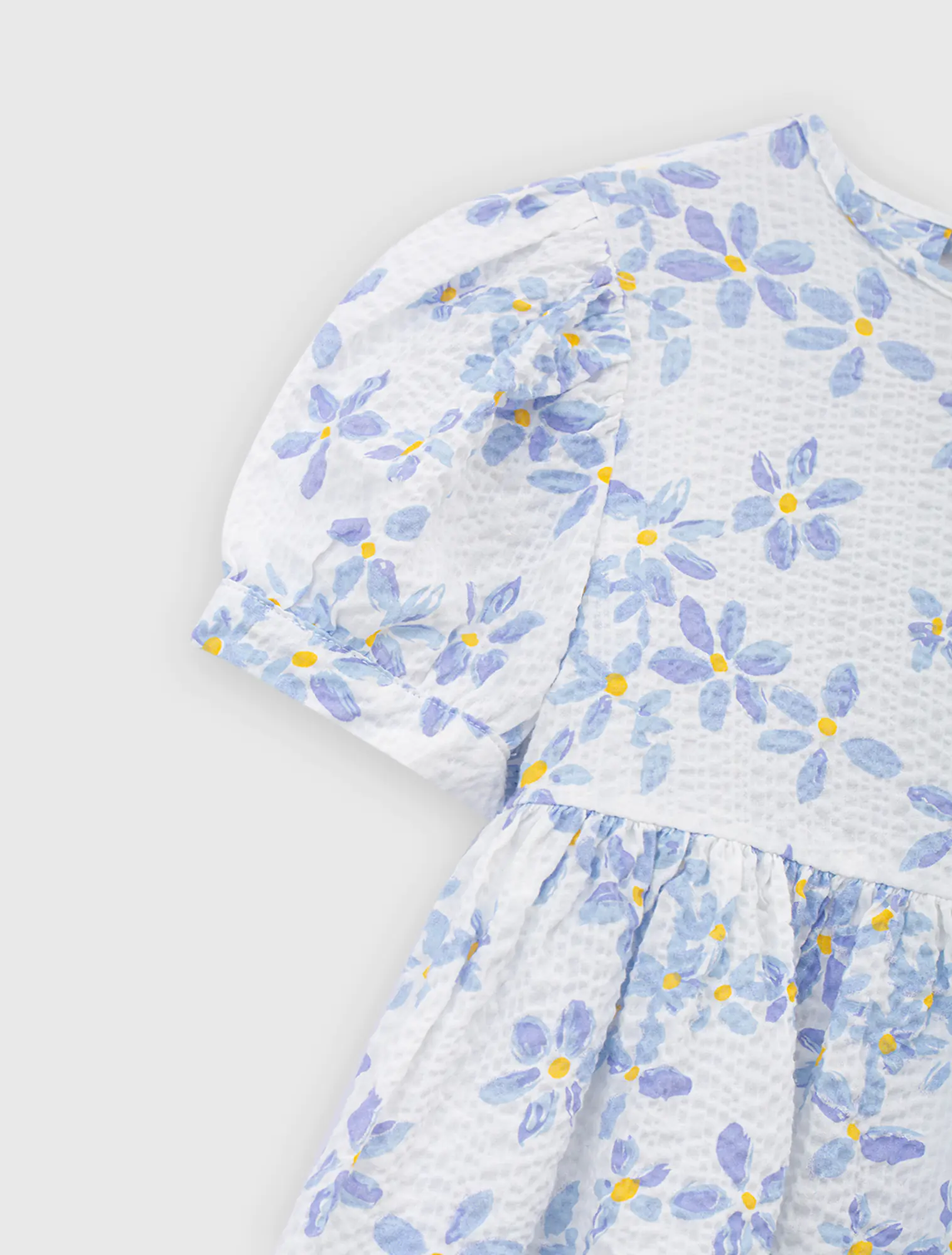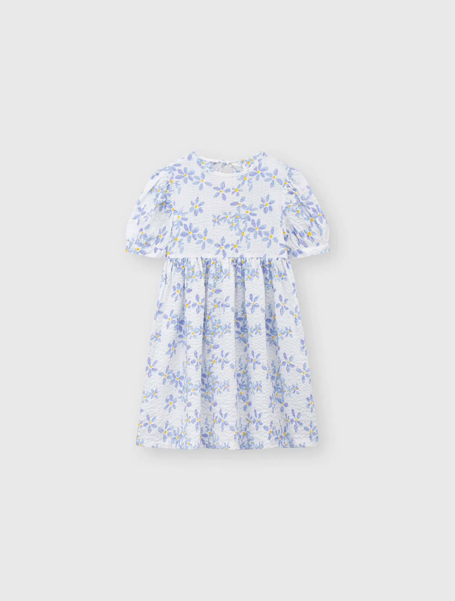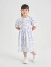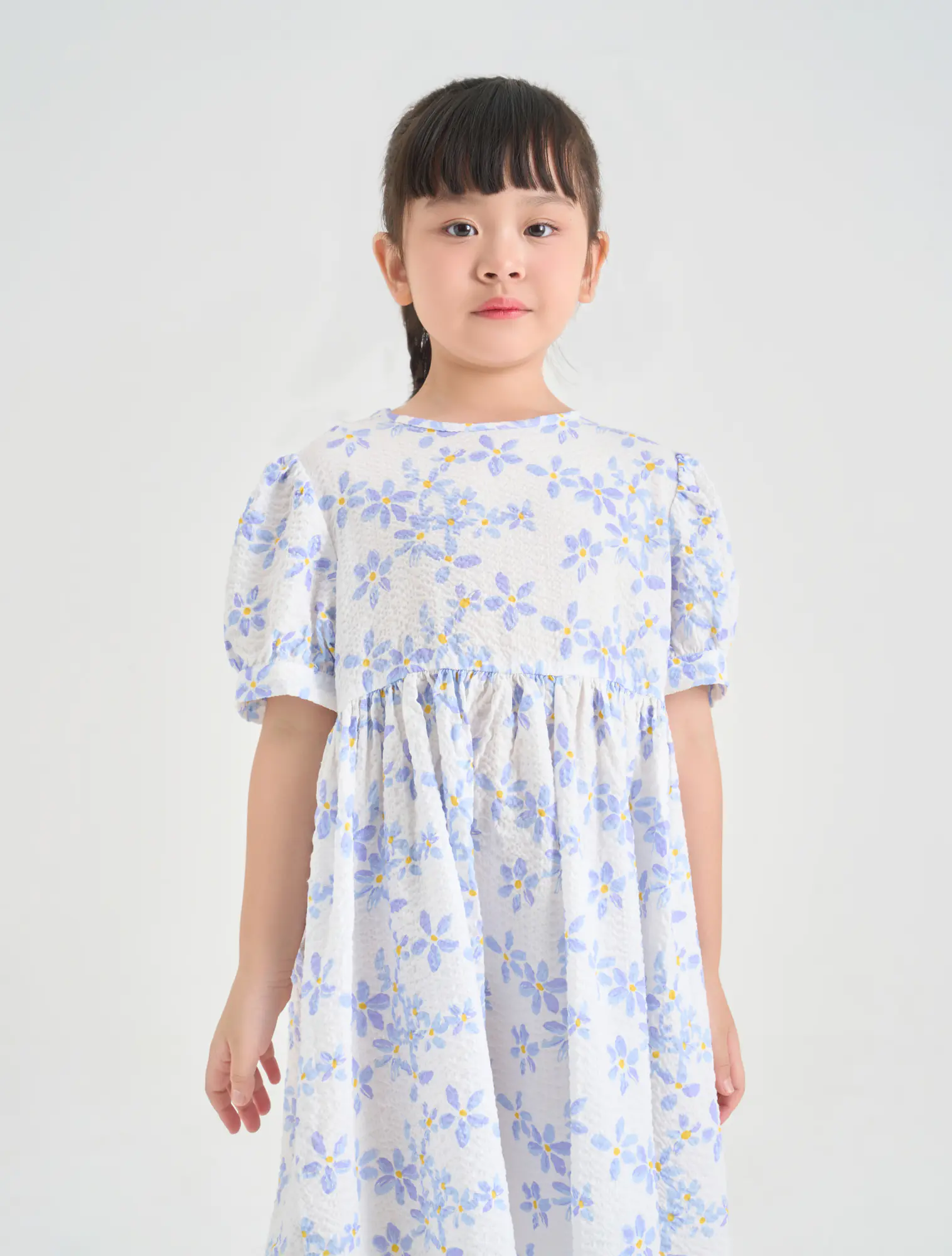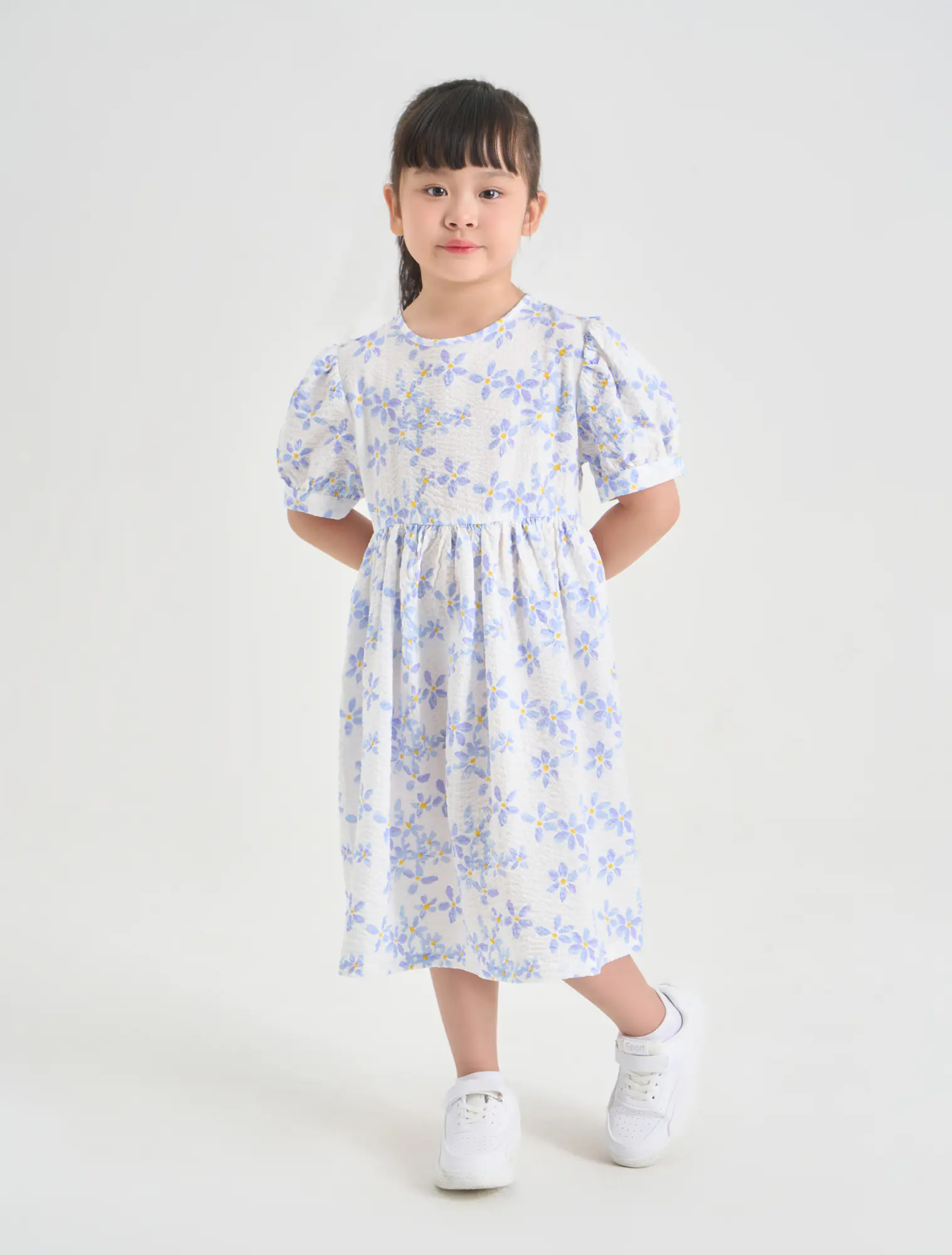 Váy bé gái dáng xòe in họa tiết, phong cách tiểu thư đáng yêu. Tay có nhún chun tạo hiểu ứng bồng xinh xắn.